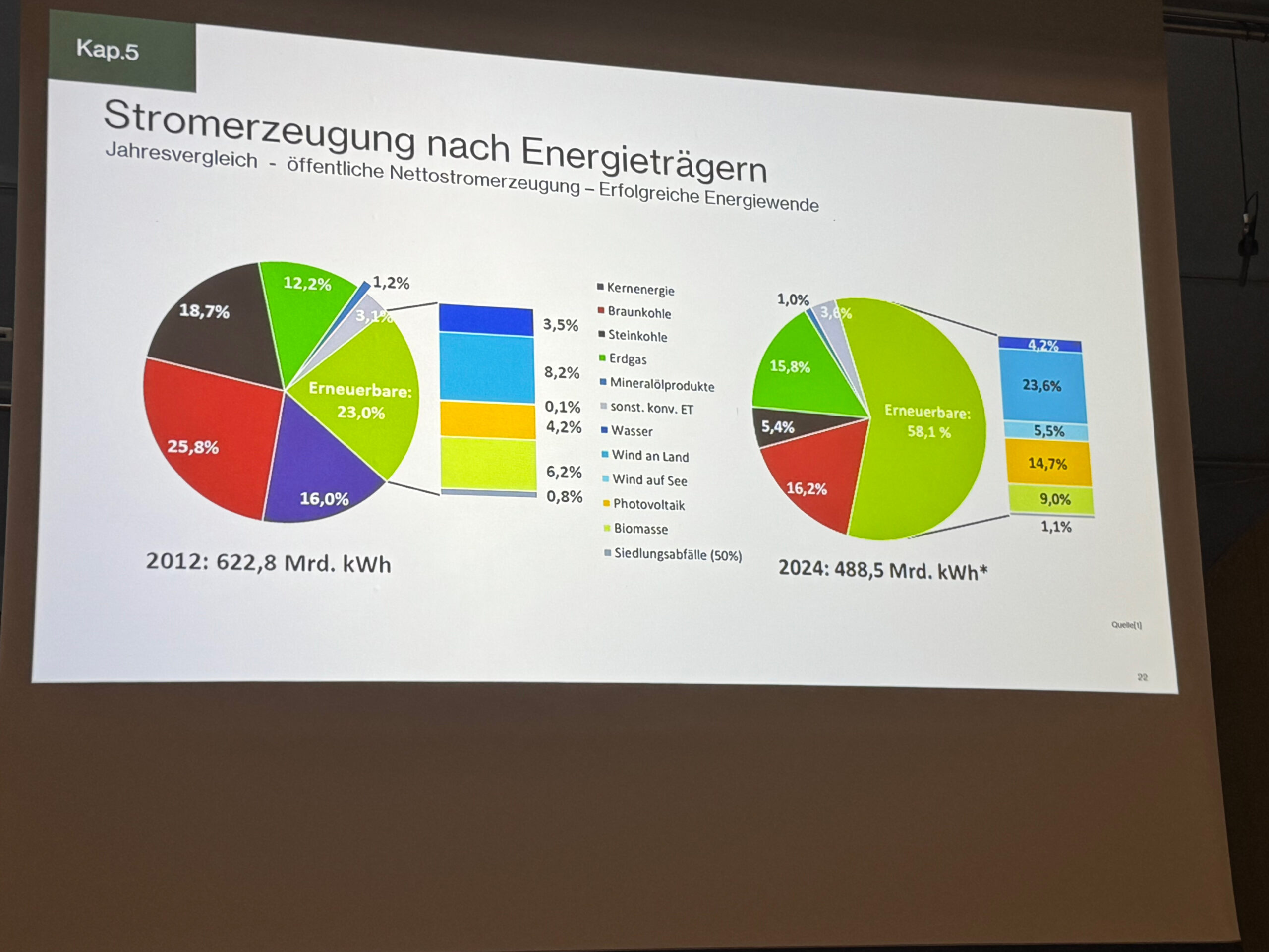 Im Jahr 2012 betrug der Anteil der erneuerbaren Energien an der Stromproduktion 23 Prozent, in 2024 waren es bereits 58 Prozent. „Generell schwankt die Stromerzeugung durch die Erneuerbaren mehr“, so Joseph Michel. Während der durch Windkraft erzeugte Strom noch immer ganz überwiegend im Norden der Republik produziert wird, wird er aber vor allem im Süden benötigt.