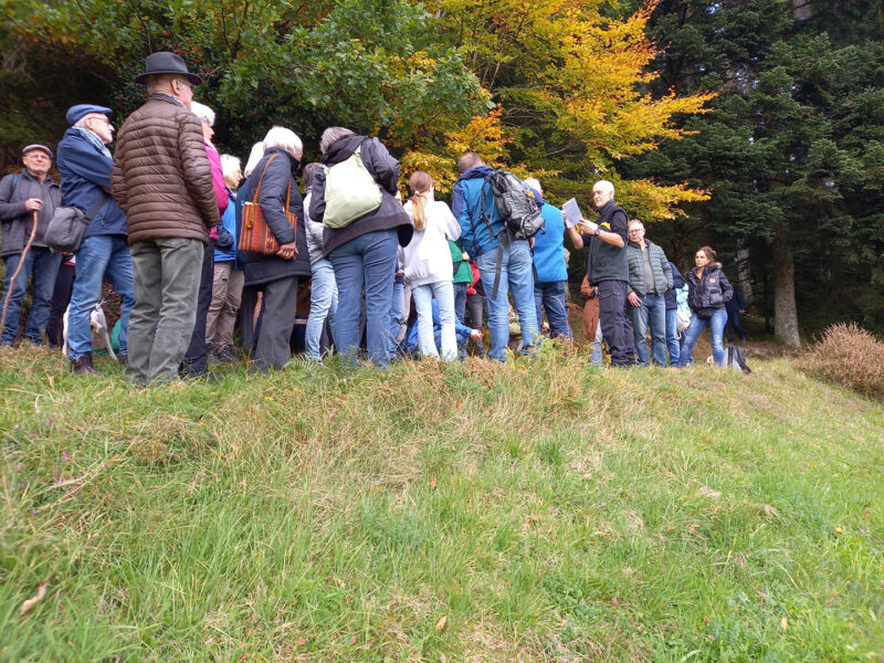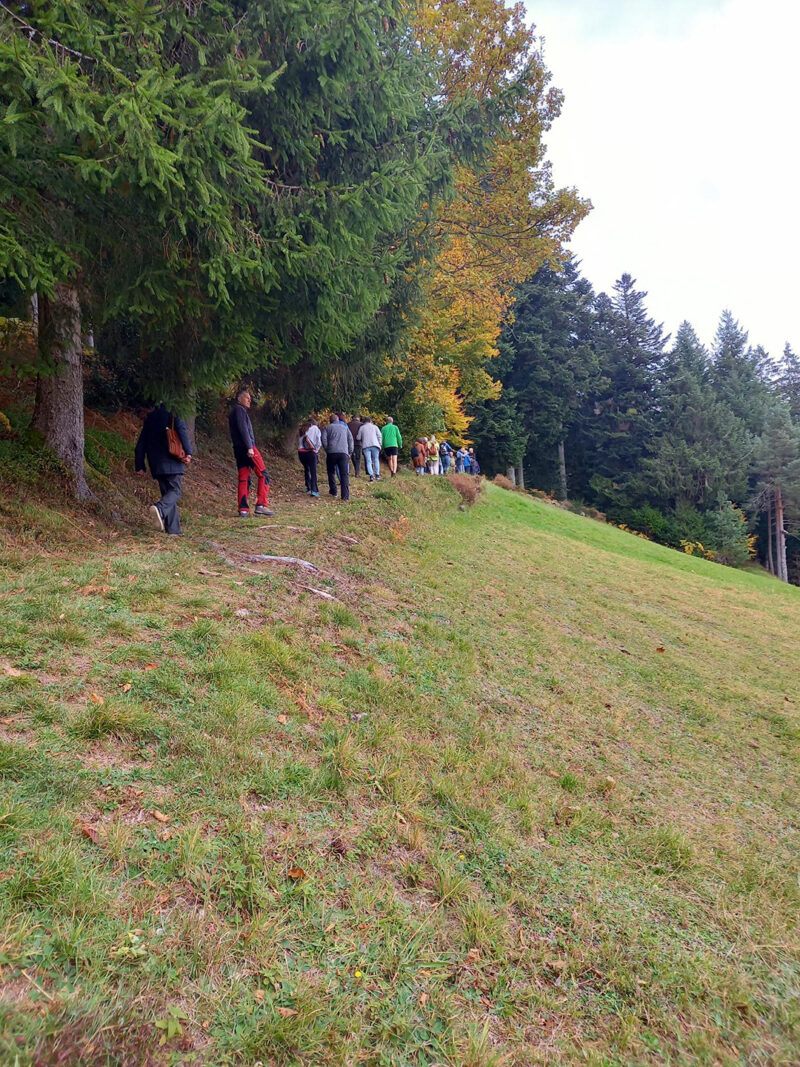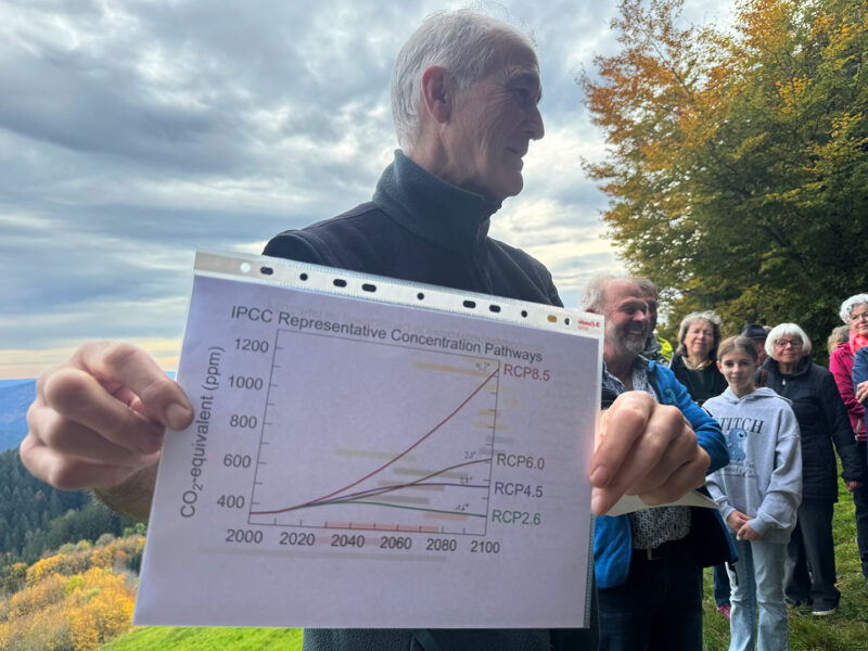 Den Anstieg durch den Wald nutzte Lutz Weinbrecht immer wieder für kurze Verschnauf-Pausen, in denen er auch viel Aktuelles berichtete. „Es ist inzwischen unstrittig, dass die erhöhte CO2-Konzentration von den Menschen verursacht und gemacht wird. Gerade wurde gemeldet, dass Korallenriffe bereits gekippt sind, dieser Prozess ist irreversibel. Auch die Gletscher in der Schweiz haben seit 2005 schon ein Drittel ihres Volumens verloren“, so Weinbrecht. Ziel sei, bis 2030 circa 80% regenerative Energien zu produzieren, aktuell seien es 59%.