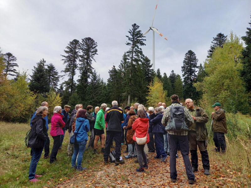 Bürgermeister Bernhard Waidele hatte sich extra diesen Sonntagnachmittag Zeit genommen, um über viele interessante Details zu „seinen Windrädern“ und deren Einfluss auf seine Gemeinde zu berichten. Die Daten und Fakten zu den Anlagen sind unten im Infokasten zu finden. Förster Lutz Weinbrecht führte die Gruppe durch den Wald und vermittelte wertvolle Eindrücke zu den verschiedenen Themen wie Flächenverbrauch, Artenvielfalt oder den Auswirkungen des Klimawandels auf unsere Wälder. Sein Fazit: „Es ist sicher umstritten, in naturnahen Mischwäldern Windkraftanlagen zu errichten. Aber wir brauchen den Zuwachs an regenerativen Energien dringend, vor allem aus der Windkraft. Denn sonst laufen wir Gefahr, dass unsere Wälder sich in den nächsten Jahren durch den Klimawandel deutlich verändern. Wir müssen klimaresistente Baumarten auf unseren Schwarzwaldhöhen pflanzen. Samenbäume sind die Grundlage der Mischwälder von morgen. Noch stehen unsere Wälder im nationalen Vergleich gut da, aber das kann sich schnell ändern“.